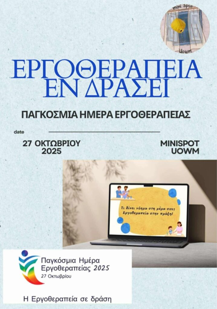 Το miniSpot UoWM αποτελεί υποομάδα της πανευρωπαϊκής πλατφόρμας SPOTeurope, η οποία απευθύνεται σε φοιτητές εργοθεραπείας και εργοθεραπευτές. Στόχος μας είναι η διεθνοποίηση και η συνεργασία φοιτητών από όλη την Ευρώπη με σκοπό τη προώθηση της εργοθεραπείας και την ανάπτυξη του επαγγέλματος μας. Παρακάτω μπορείτε να δείτε προηγούμενες δράσεις μας και να ενημερωθείτε για επόμενες.