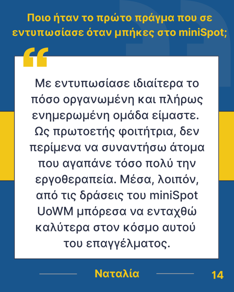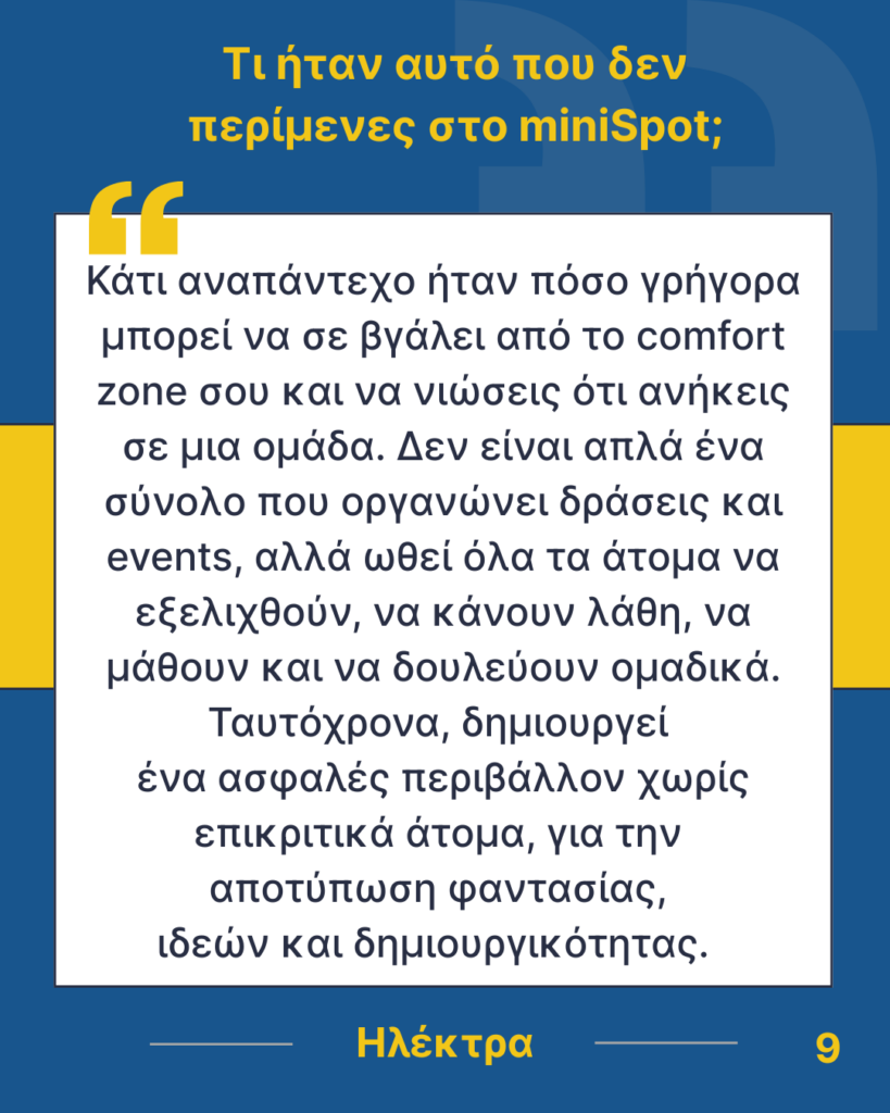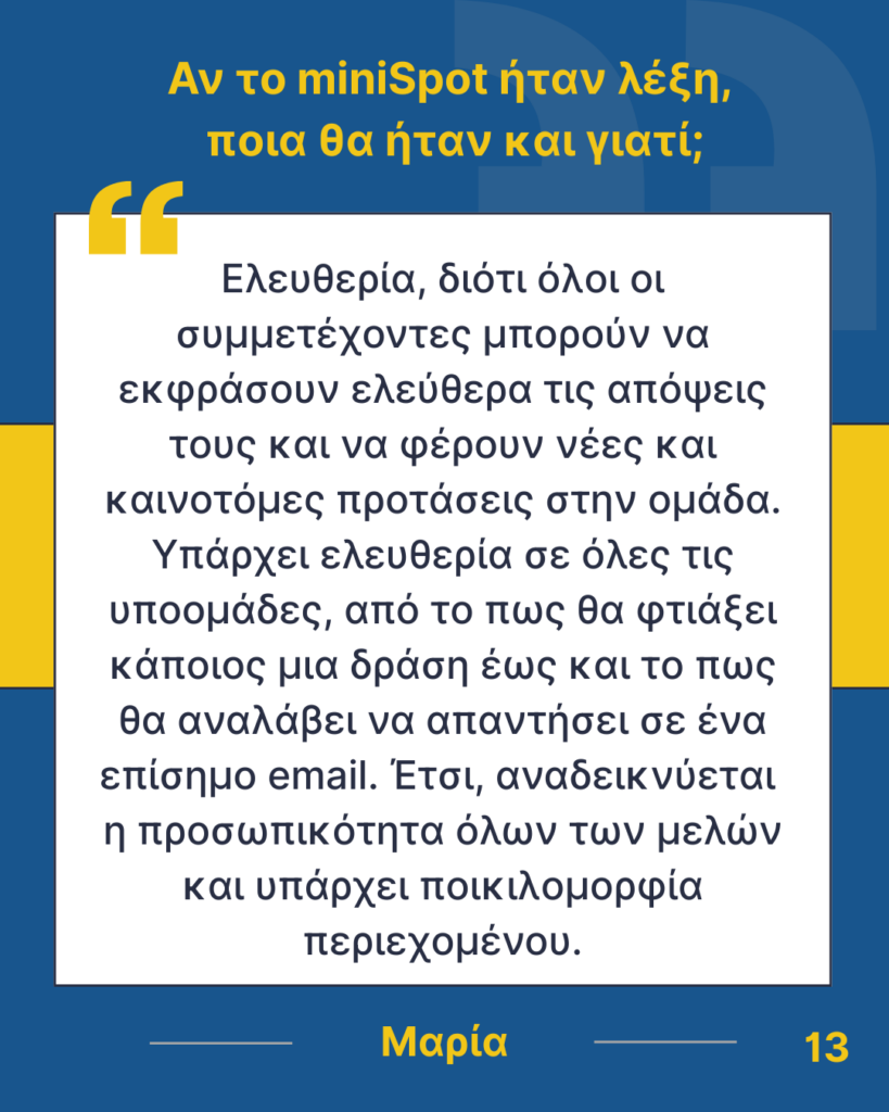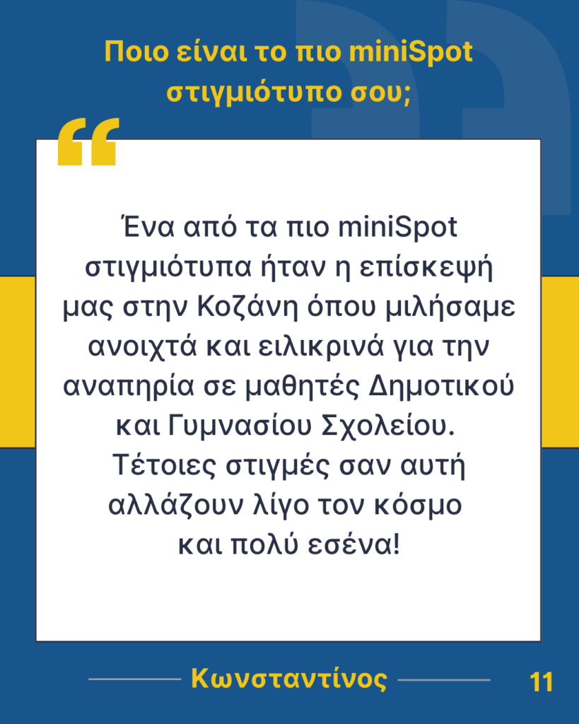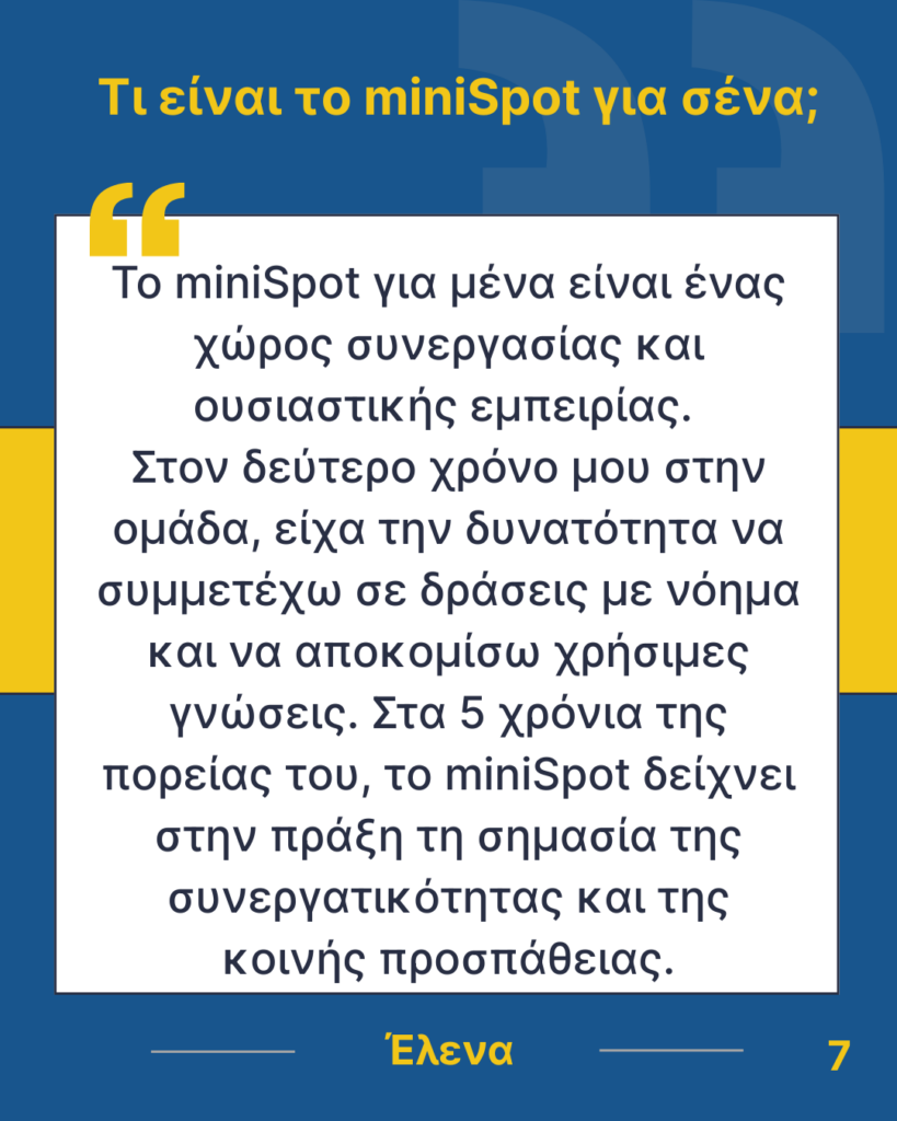 Τέλος, ένα θερμό ευχαριστώ αξίζει σε όλους όσους μας υποστηρίζουν, συμμετέχουν ενεργά στις δράσεις μας και, κυρίως, μοιράζονται μαζί μας αυτή τη μοναδική πορεία. Η παρουσία τους δίνει ζωή σε κάθε προσπάθεια και ενισχύει το πνεύμα συνεργασίας, δημιουργικότητας και κοινότητας που χαρακτηρίζει το miniSpot UoWM.
