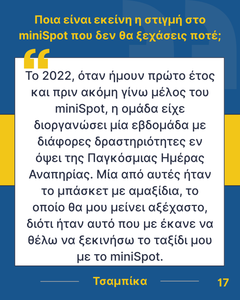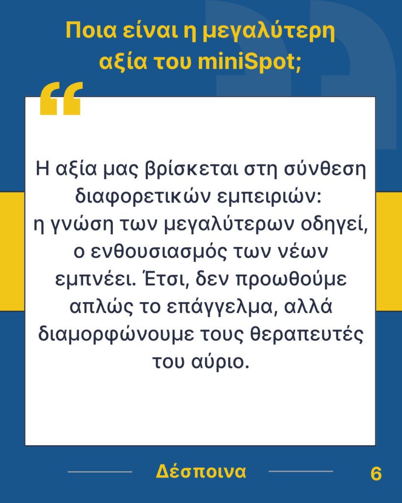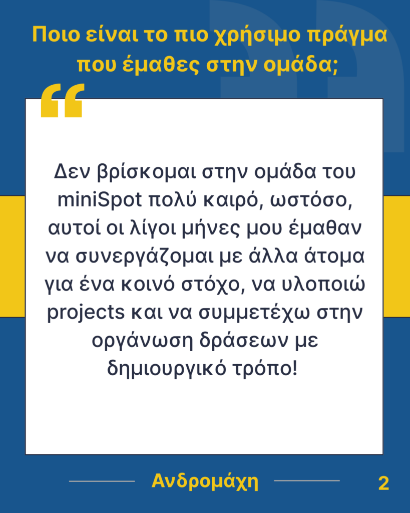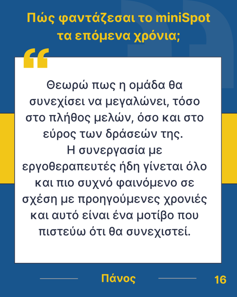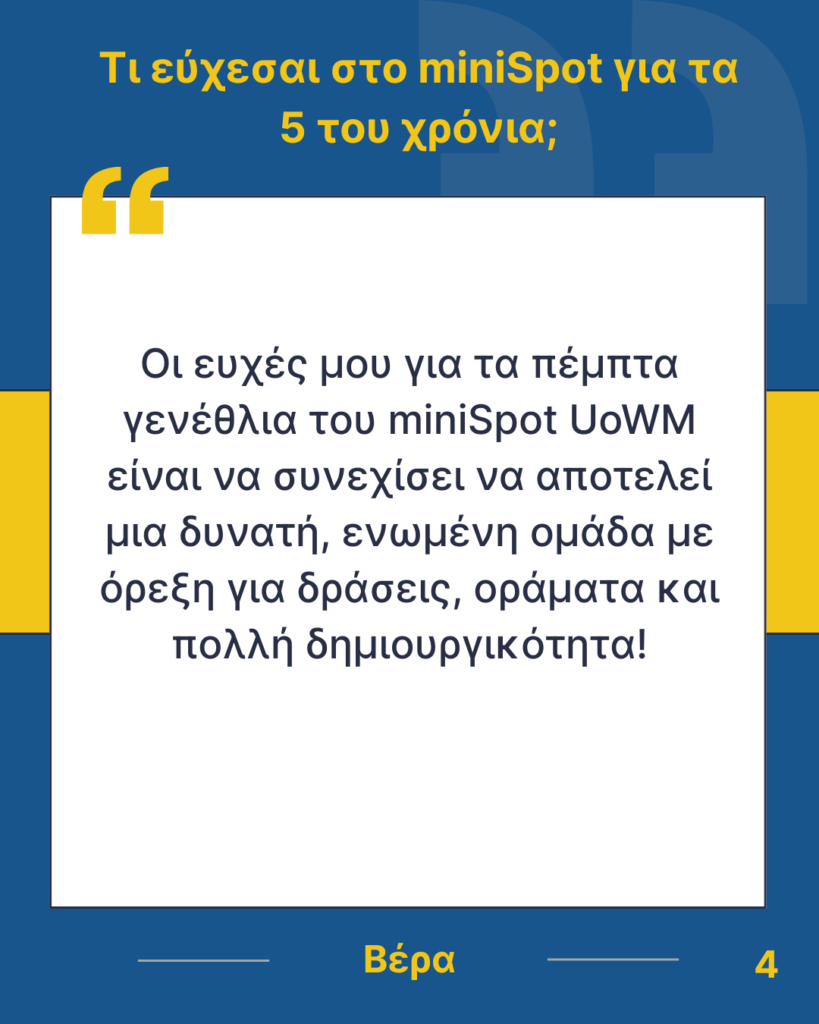 Όμως, δεν θα είχαμε φτάσει μέχρι εδώ χωρίς τους πρώτους συνιδρυτές της ομάδας, αλλά και όλους εκείνους που πίστεψαν στην ιδέα, ακολούθησαν το όραμά της και συνέβαλαν στην εξέλιξή της. Με τη δέσμευση, τη δημιουργικότητα και το πάθος τους, έθεσαν τις βάσεις για να φτάσουμε στο σημερινό σημείο, και είναι εμφανές πως η επιρροή τους συνεχίζει να ζει σε κάθε νέο μέλος. Με τη σειρά μας, συνεχίζουμε αυτό το έργο, ανοίγοντας δρόμο για όσους θα ενταχθούν στο μέλλον και θα διατηρήσουν τις αξίες και το πνεύμα του miniSpot UoWM.